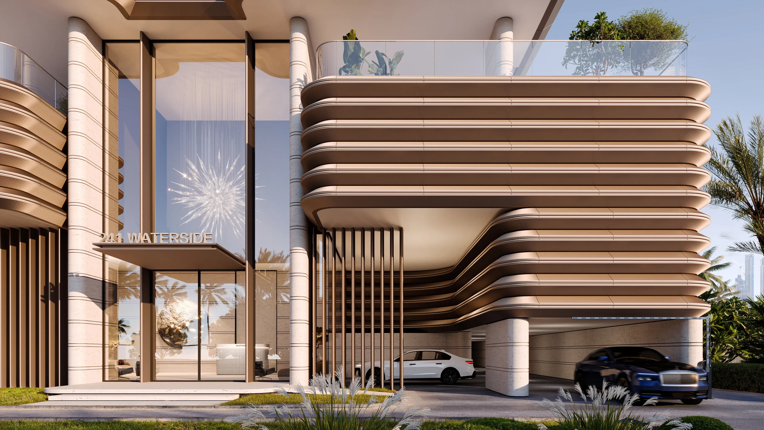 With stacked terraces and flowing horizontals, 241 Waterside rises in balance and proportion. Light, stone and glass open to serene vistas of calm & clarity, blurring indoors and out, creating a rhythm where architecture and horizon become one. Here, every surface is a deliberate interval - Rooms are not decorated; they are calibrated. Materiality speaks in undertones: the matte of lacquered bronze that refuses to announce itself, stone cut thick enough to hold temperature, wood so pale it seems to defer. Nothing competes for attention because nothing needs to. The luxury is measured in what has been removed - pattern, ornament, the anxious need to impress.